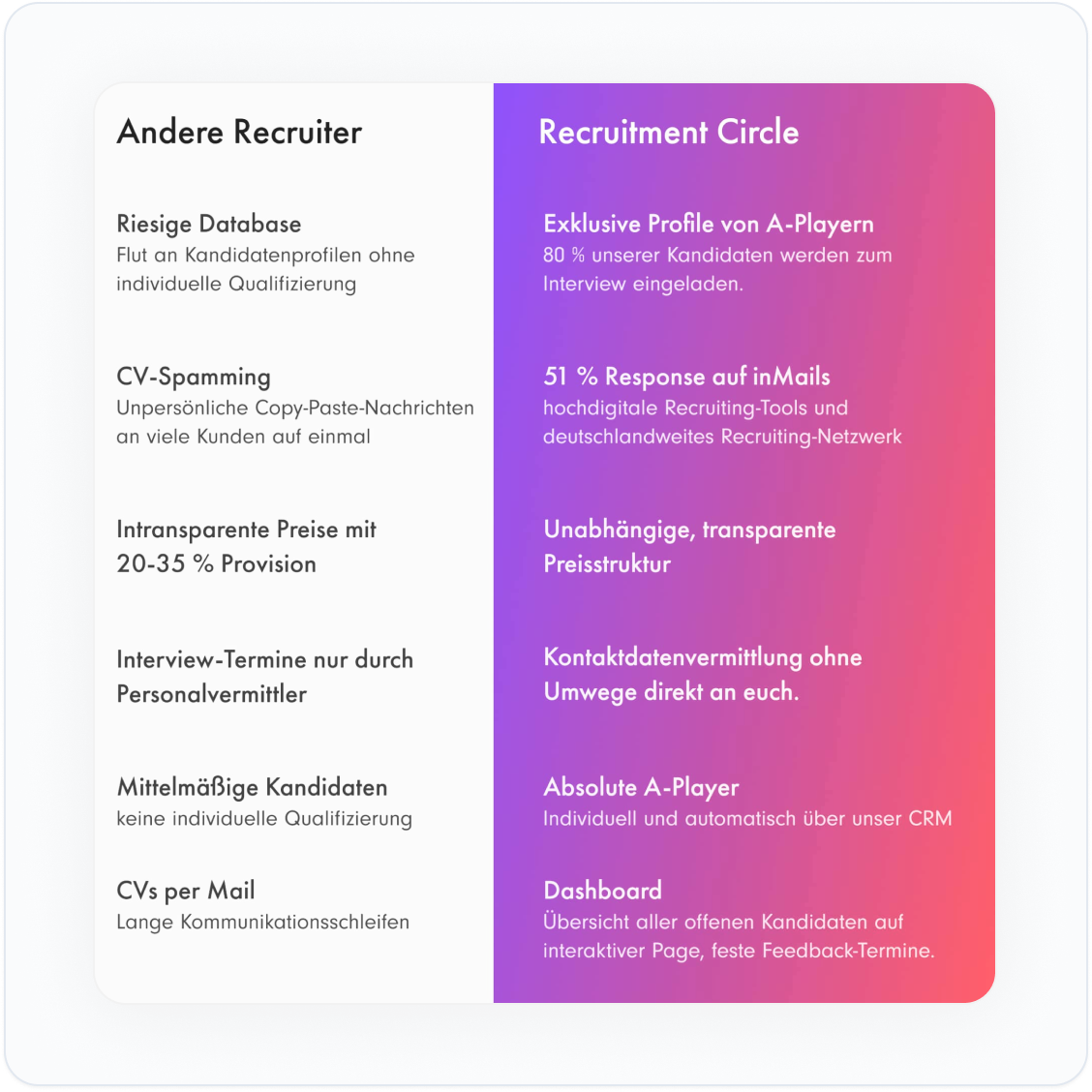 "Uns ist sehr wichtig, dass Partner im Interesse der Kandidaten handeln und nicht nur Umsatz sehen, und Recruitment Circle funktioniert da super, weil sie das fachliche Verständnis mitbringen, die Bewerber super betreuen und die Vorschläge langfristig ins Team und zur Kultur passen."